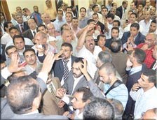 واصل المحامون أمس اعتصامهم لليوم الثالث علي التوالي بمقر النقابة اعتراضاً علي مشروع قانون المحاماة المعروض علي مجلس الشعب. ردد المعتصمون هتافات منددة بمشروع القانون وأعضاء المجلس والنقيب منها»حمدي خليفة باطل.. عمر هريدي باطل.. مجلس النقابة باطل«. أكد المعتصمون استمرارهم علي موقفهم حتي تم سحب المشروع من مجلس الشعب وسحب الثقة من النقيب وأعلن منتصر الزيات عضو مجلس النقابة السابق رفض المحامين للتعديل الذي وصفه بالمشبوه واللقيط، واكد اصرار المحامين علي سحب القانون نهائياً من مجلس الشعب وأعلن محمد طوسون عضو المجلس في مؤتمر صحفي علي هامش الاعتصام رفضه التام للتعديل داعياً المحامين الي الخروج في مسيرة بالأرداب السوداء لمجلس الشعب في حال عدم سحب القانون او حتي علي الأقل تأجيله، واتهم القائم علي التعديلات بمحاولة تفضيل مقعد نقيب المحامين علي مقاس فئة معينة من المحامين لاهتمام التعديلات بالنظام الانتخابي وأعلن محمد الدماطي عضو مجلس النقابة بلجنة الحريات عن تقدمه ببلاغ للنائب العام ضد حمدي خليفة نقيب المحامين اتهمه فيه بتقديم اوراق مزورة لمجلس الشعب بموافقة مجلس النقابة علي مشروع التعديل وشدد علي ضرورة الاستمرار في حالة سحب الثقة من النقيب والمجلس الحالي لأنهم »سُبة« في جبين نقابة المحامين وتضامن »محمد هزاع« امين الصندوق المساعد وعبدالسلام كشك ومختار العشري وخالد ابوكريشة اعضاء مجلس النقابة مع المعتصمين مطالبين بضرورة سحب المشروع من المجلس.